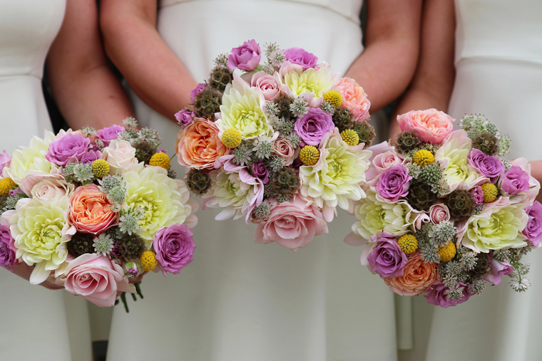 Love how the pastel tones of the flowers (roses, dahlia, craspedia and poppy seed heads), bridesmaid gowns and ties pack such a punch against the contrasting sharp navy suits - colour heaven!