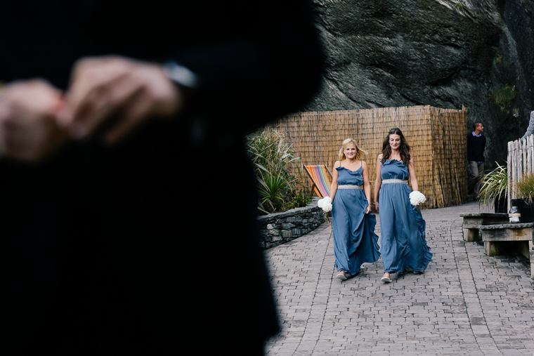 Nick wore a navy blue moleskin suit (inspired by Bradley Wiggins when he received his Sports Personality of the year award) with a grey woollen waistcoat that was part of a suit that his Dad had in the 70s/80s, he also wore a wetsuit and tux t-shirt during the reception! The grooms-men wore their own suits with grey woollen ties from ‘elegant extras’.